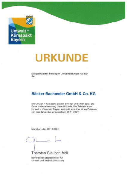 Landrat Michael Fahmüller überreichte uns dieses Jahr die Urkunde zum Umwelt- und Klimapakt Bayern – eine Anerkennung, auf die wir sehr stolz sind.